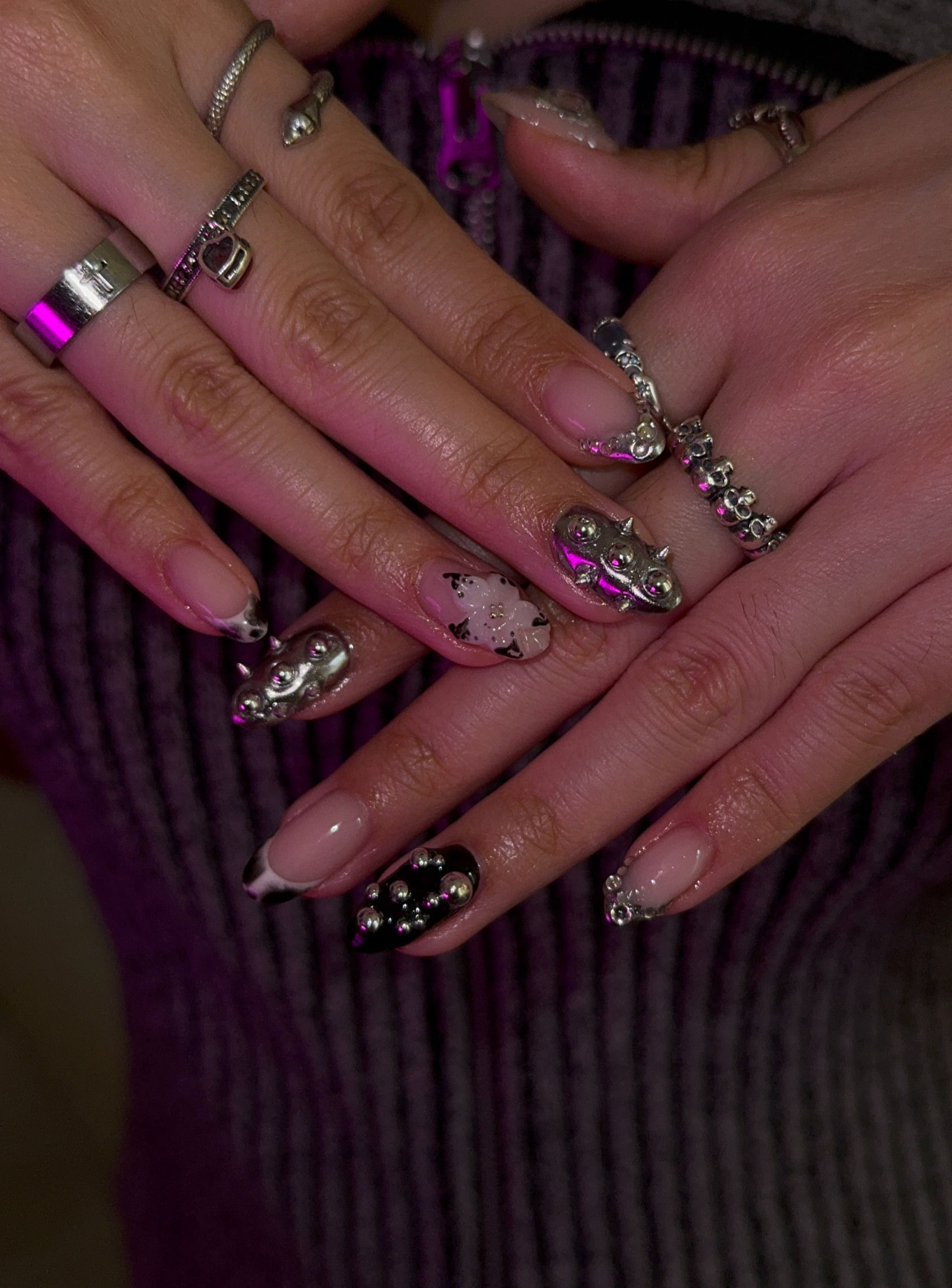 Includes: chrome French tips, 2 flowers, french tips ombré effect, charms, Price is for short length